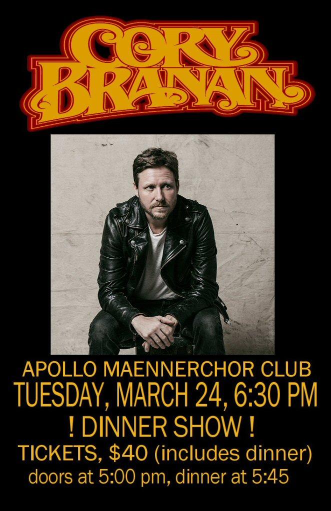 Tuesday, March 24 at 5:45 pm. Singer-songwriter Cory Branan will be performing a dinner show in the club room. Click Poster Image for show information or click at bottom for online ticket order.